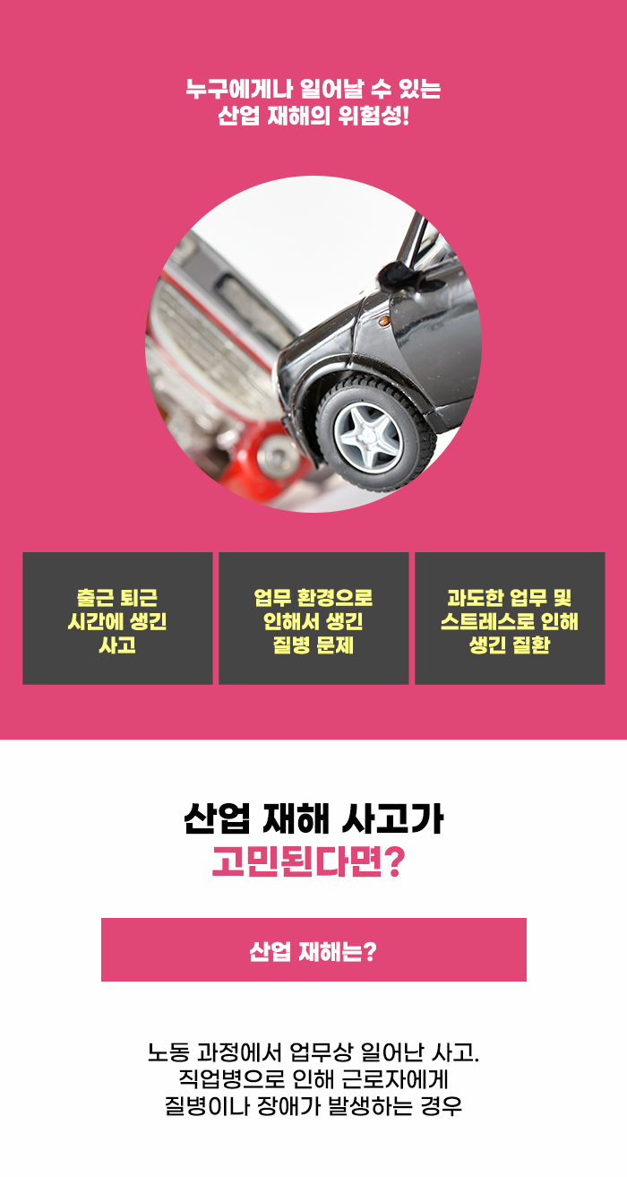 또한 산업 재해에 관해서 잘 모르는 분도 있는 것 같은데요, 업무상 생긴 사고, 질병 등을 두고 산업 재해라고 합니다. 산업 재해라고 하면 건설 노동자, 공장 근로자같이 현장에서 일을 할 때, 사고가 나는 것만을 생각하는 경우도 있습니다. 하지만 실제로는 과중한 업무로 인해 생기는 직업병, 질병도 속할 수 있다고 합니다.