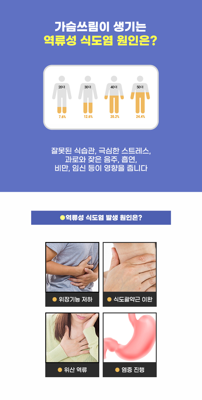 위의 기능이 떨어지며 위와 식도를 연결하는 부분이 느슨해지고, 위의 내용물이 식도로 역류하는 문제가 생기기 쉬워질 수도 있습니다. 이런 문제를 역류성 식도염이라고 하는데요, 신트림이나 신물, 가슴쓰림 같은 문제가 생기게 되고 식도의 건강이 큰 위협을 받을 수도 있습니다.