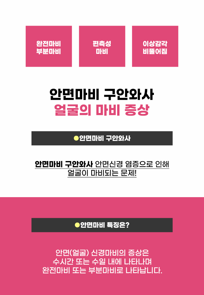 또한 얼굴의 감각 이상, 표정을 짓기 힘든 마비 증상이 생기는 것 말고도, 얼굴 신경 문제로 인해 얼굴에 강한 통증이 생겨 걱정하는 분도 있는데요, 안면마비 문제와 다르지만, 비슷한 점이 있는 이 문제는 삼차신경통이라고 합니다. 현재 평택안면마비 걱정될만한 문제를 겪고 있다면 올바른 대응을 할 수 있었으면 합니다.