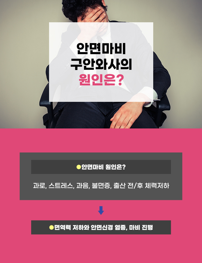 출산 전/후 체력 저하, 큰 수술 후의 체력 저하가 영향을 줄 수도 있다고 하며, 불면증이나 과로, 심한 스트레스 등으로 인해 지치는 것도 안면마비의 발생에 영향을 줄 수도 있다고 합니다. 안면신경의 염증이 생기게 되고, 얼굴이 마비되는 증상과 함께 수포가 생기는 경우도 있습니다.