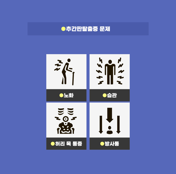 디스크가 찢어지면서 내부의 수핵이 탈출할 수 있는데요, 이렇게 돌출된 수핵이 주변의 신경근을 자극하게 될 수 있다고 합니다. 그러면서 통증이 생기고 염증이 발생할 수 있는데요. 신경 증상이 나타나게 되기도 합니다. 이런 문제를 두고 추간판 탈출증이라고 합니다. 또 간단하게 줄여서 디스크라고도 많이 불립니다.