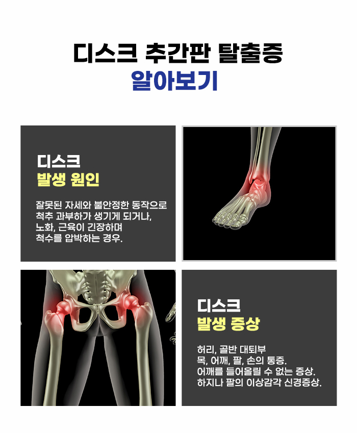 추간판 탈출증은 허리 부분인 요추나 목 부분인 경추에 주로 발생한다고 하는데요, 그렇기에 허리 통증과 하지의 신경 증상, 그리고 목 통증과 팔이나 손의 무감각, 저림 등의 신경 증상이 주된 증상이라고 합니다. 현재 이런 이유로 평소에 걱정하는 분이라면, 더 문제가 진행되기 전에 좋은 자세를 찾을 수 있었으면 좋겠습니다.