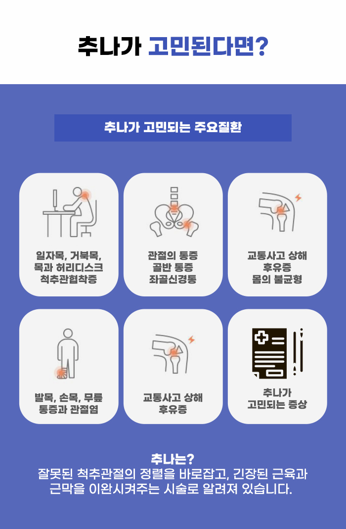 나쁜 자세를 할 경우 신체의 근육이 지나치게 이완되거나, 반대로 지나치게 긴장될 수 있습니다. 이런 상태에서는 좋은 자세를 하려고 해도 불편함이 느껴지고, 몸에 나쁜 자세가 오히려 편하게 느껴질 수 있는데요, 추나는 지나치게 이완되거나 긴장된 근육, 근막 등을 바로잡아주는 것을 기대하는 것이라고 합니다.