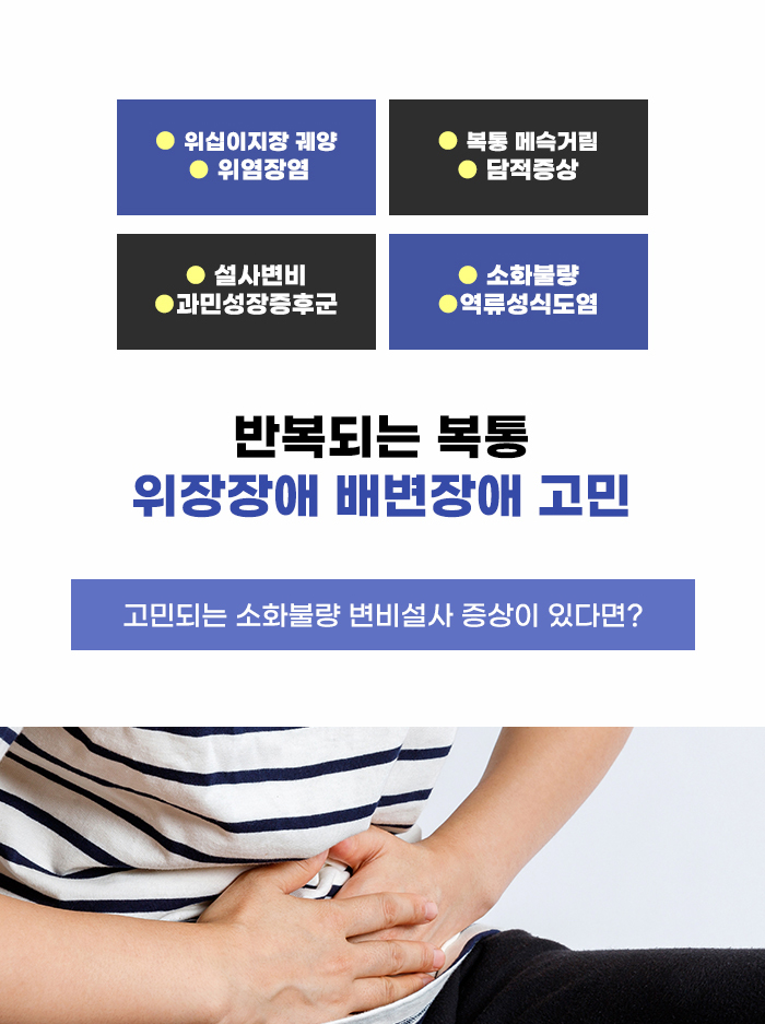 식사 습관, 생활 습관 등의 이유로 복통, 설사, 변비 등의 증상을 일시적으로 누구나 겪을 수 있습니다. 그렇다 보니 이런 증상이 생겼을 때도, '특별한 일은 아니겠지...', '그냥 시간이 지나면 낫겠지...'같은 생각을 하면서 그냥 참거나 간단히 약만 구해 먹는 분이 적지 않은 것 같습니다. 하지만 증상이 점점 심해지고, 반복되면서 일상생활의 질이 크게 낮아질 수도 있는데요.