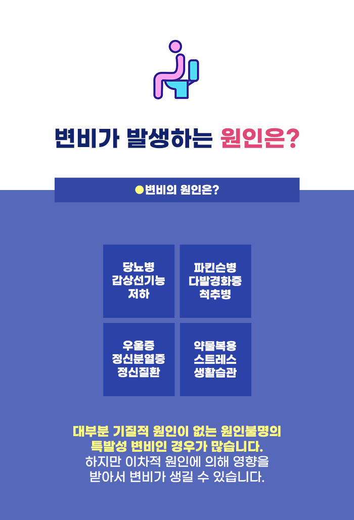 평택내과추천 정보 고민되는 변비! 왜 변비 증상이 생길까요? 변비 문제는 특별한 이유로 인해 생기는 경우도 있지만, 많은 경우 특발성 변비에 속한다고 합니다. 변비에 영향을 주는 질환을 알아보자면 대장 종양, 치열과 치질, 항문 협착, 염증성 장질환, 허혈성 대장염, 결핵성 대장염 등이 있다고 합니다. 또한 감염병이나 대사질환 그리고 내분비 질환에 의해서도 변비가 유발될 수도 있다고 합니다.