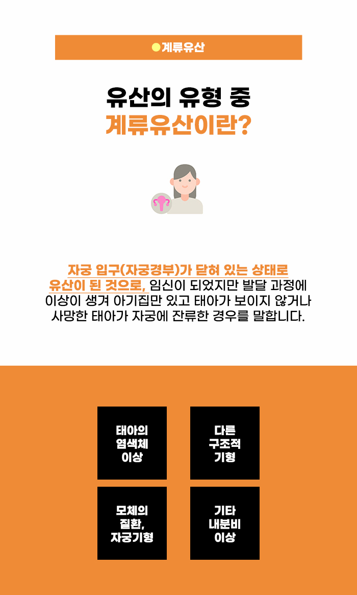 계류유산은 임신은 되었지만, 발달 과정의 이상으로 인해 아기집은 관찰되더라도 태아가 보이지 않는 경우, 혹은 사망한 태아가 자궁 내 잔류하는 상태를 말한다고 하는데요, 그렇기에 유산이 된 것을 알지 못하다가 정기 검진 등을 통해 계류유산이 된 것을 알게 되는 경우도 있다고 합니다. 계류유산의 원인 역시 여러 가지가 있지만 특히 염색체 이상이 주된 원인이라고 합니다.