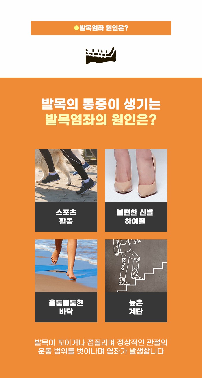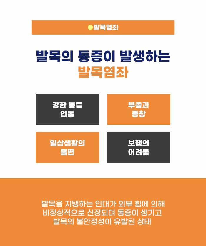 특히 여러 사고 중, 교통사고와 더불어 많은 분이 겪을 수 있는 사고가 바로 발목염좌라고 합니다. 발목은 다리와 발을 잇는 부분입니다. 이 부분이 움직이며 걷고 뛸 수 있는데요. 이 발목이 원래 움직여야 하는 정도로만 움직이는 게 아니라, 관절의 가동 범위를 벗어나 무리하게 꺾이는 경우가 있습니다. 이런 경우 발목염좌 문제로 통증이 생기기도 합니다.