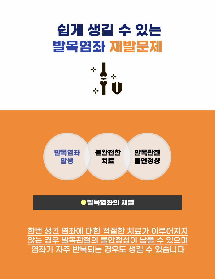 발목이 꼬이거나 접질리면서 생기는 발목염좌는 한 번 생긴 후에 적절한 대처가 이루어지지 않을 경우, 다시 재발하기 쉬울 수도 있다고 하는데요. 불안정성이 남아 염좌가 자주 재발할 수도 있다고 합니다. 그렇기에 교통사고 등 다른 외상 사고처럼 작은 문제라고 생각해 쉽게 넘기지 말고 꼼꼼히 내 몸의 이상을 살필 수 있었으면 합니다.