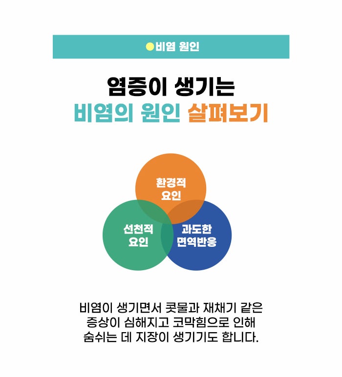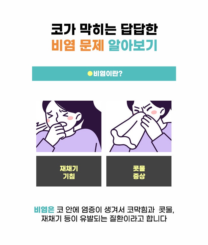 그리고 비염 증상이 반복되면서 반복적인 염증으로 인한 합병증으로 다른 증상이 생길 수도 있는데요, 인후염, 중이염, 그리고 부비동염 등의 문제입니다. 인후염은 목구멍 부근에 염증이 생기는 것이며, 중이염은 귀 안에 염증이 발생하는 것인데요. 부비동염은 머리뼈안의 빈 공간에 염증이 발생하는 것이라고 합니다. 내 일상을 답답하게 하는 비염, 호흡기 관련 고민이 있을 경우 나쁜 환경을 정비하고, 건강에 좋은 습관을 꾸준히 지켜가시길 바랍니다!