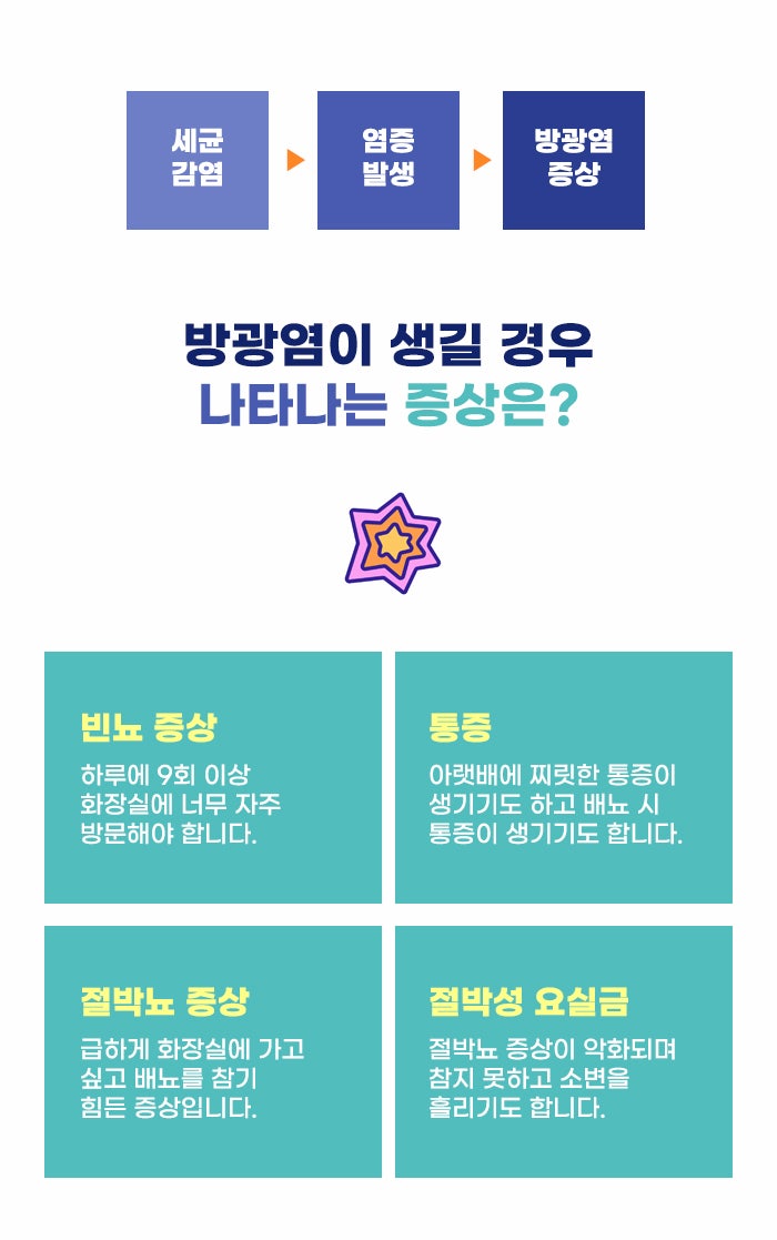 방광염이 의심될 만한 증상이 있을 경우 되도록 증상을 방치하지 않는 게 좋다고 합니다. 시간이 지나면 염증이 낫겠지 생각하기도 하지만, 시간이 지날수록 염증이 더 심해지고, 증상도 더욱 악화될 수도 있기 때문인데요. 염증이 악화되고 반복될 경우 만성 방광염 증상을 겪을 수도 있으며 염증이 방광 안에만 국한된 것이 아니라 퍼질 가능성도 있다고 합니다.