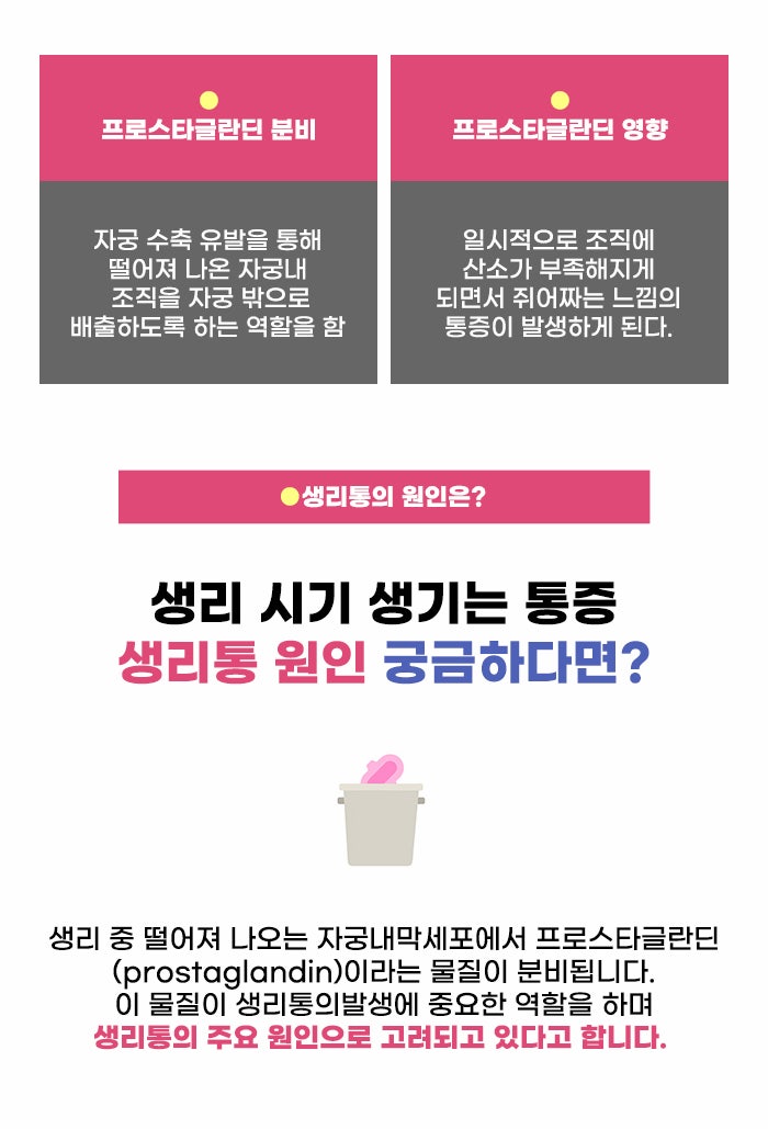 배란 전 자궁내막보다 배란 후에 더 높은 농도로 발견되는 물질인 프로스타글란딘은 월경 시 자궁근육의 강한 수축을 유발하는 물질이라고 하는데요. 그렇다 보니 자궁의 수축을 겪는 산통과 생리통이 발생하는 기전은 유사할 수 있다고 합니다. 프로스타글란딘 물질에 영향을 받은 생리통으로 인해 통증이 생기는 것 말고도 생리 시기, 혹은 생리 전/후로 여러 어려운 증상이 생기는 경우도 있다고 합니다.