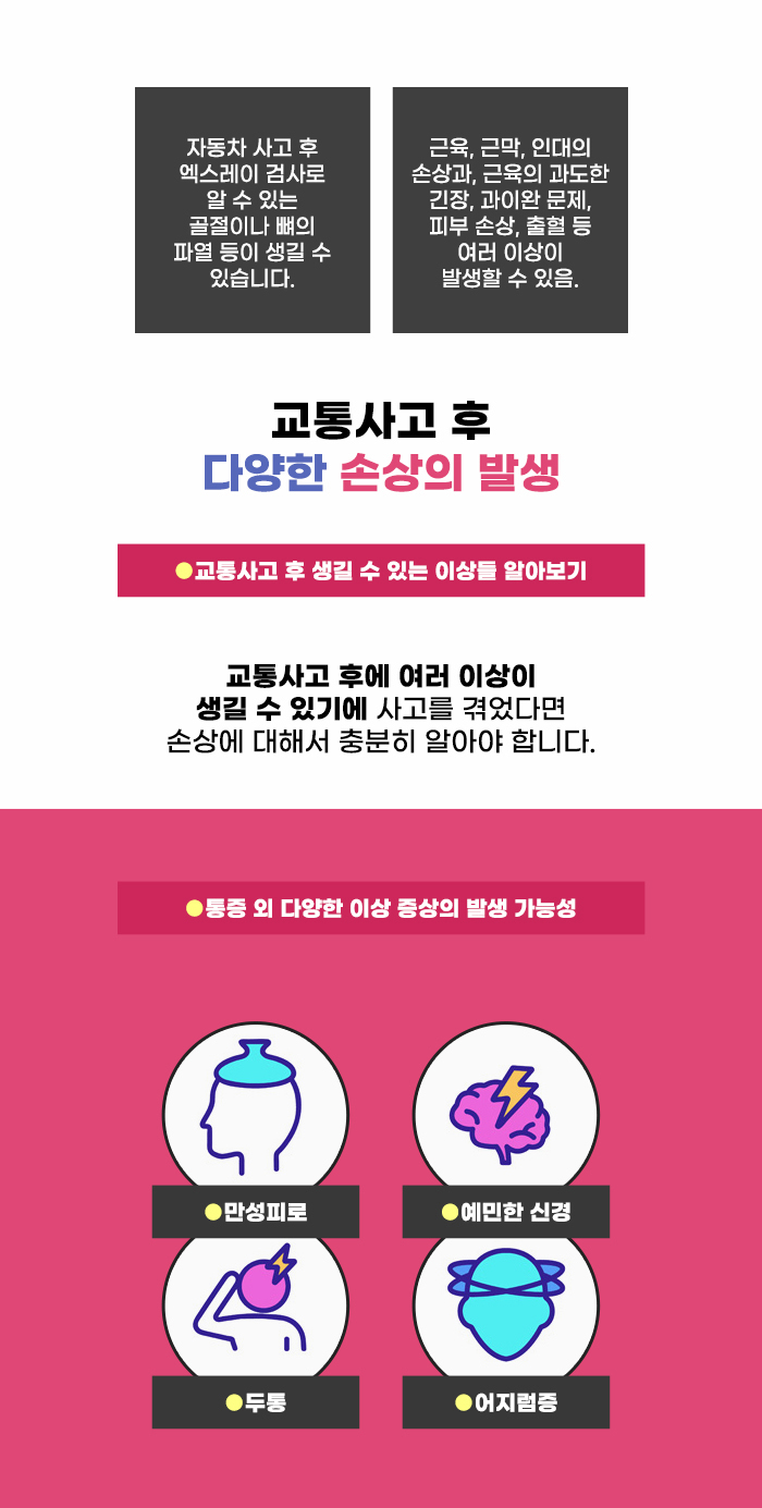 환경오염과 복잡해진 도로, 교통 체증 같은 문제가 생기게 되었지만 여러 문제 중에서 가장 큰 문제는 바로 사람의 생명과 건강에 급격하게 영향을 미칠 수 있는 교통사고일 것 같습니다. 교통사고가 생긴 후에는 뼈의 금, 골절, 인대나 근육 손상, 근막 손상, 몸의 불균형, 두통 등 다양한 문제가 생길 수도 있다고 하며 이런 이상은 눈에 띄지 않을 수도 있다고 합니다.