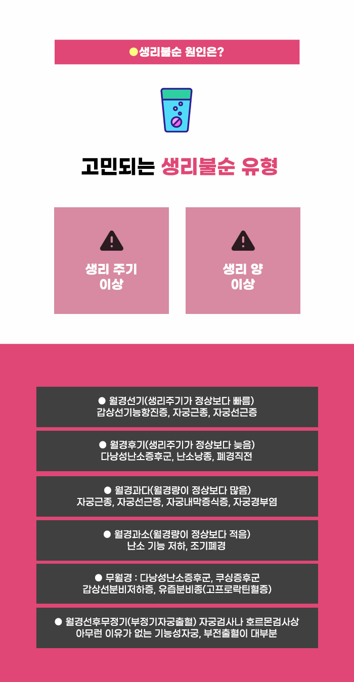 생리 기간 중에 생기는 통증은 생리통이라고 하는데요, 허리 통증이나 하복부 통증, 두통 등의 증상이 생기기도 하고, 그 외의 강한 피로감, 무기력감, 심리적 변화 등이 생기기도 합니다. 그리고 생리주기 이상, 생리 양 이상 등의 다양한 문제를 겪는 경우도 있습니다.
