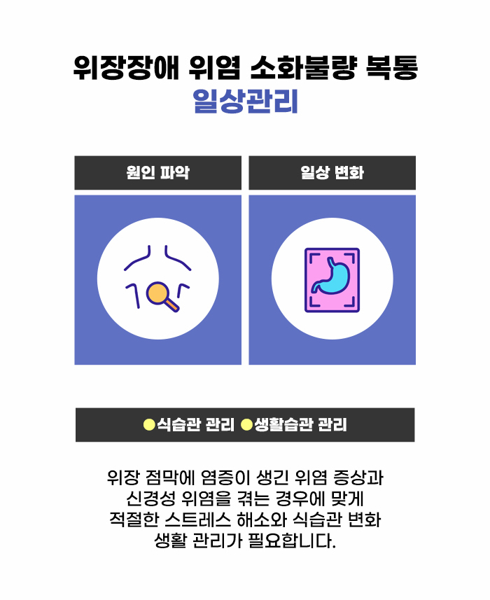 이미 위장장애 증상과 복통 같은 문제가 있다면 검사상 드러나지 않아도 위장의 기능이 떨어진 상태일 수 있기에 생활 관리 등을 통해 노력하는 게 필요할 수도 있다고 합니다. 또한 평소 먹는 약물의 영향을 받을 수도 있기에 평상시 먹는 영양제나 약물을 확인하는 것도 필요할 수 있다고 하며 금연, 금주 등을 위해 노력하는 게 좋습니다.