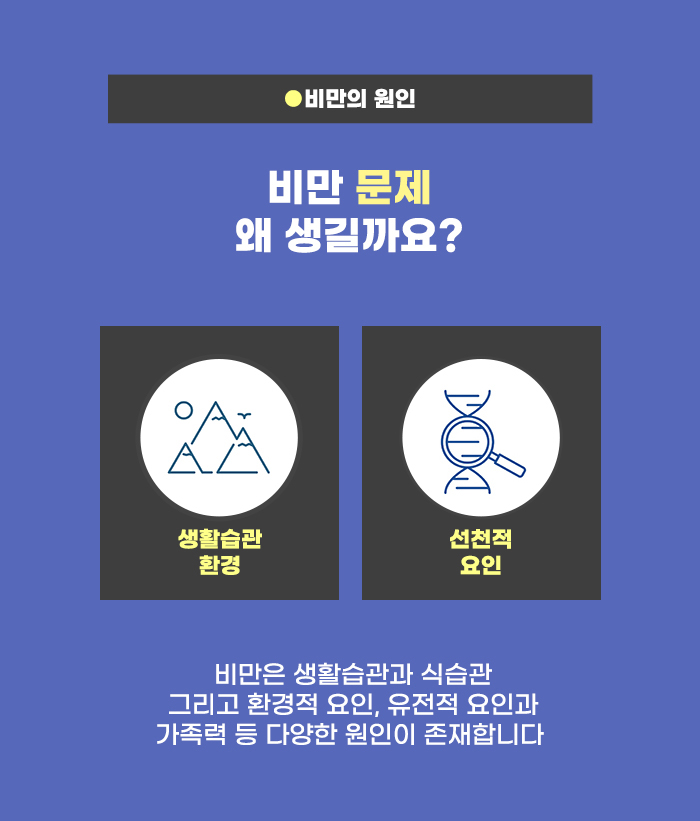 비만 상태에서 다이어트를 하는 것은 더 어려울 수 있는데요. 과체중을 넘어 비만이 될만한 원인을 파악하는 게 그렇기에 중요합니다. 단순히 개인의 게으름, 식탐 같은 것으로만 문제를 생각할 경우 비만에서 벗어나는 다이어트 과정이 번번이 실패로 돌아가기 쉬울 수 있습니다. 잘못된 습관에서 벗어나 건강한 습관을 유지하는 게 필요할 수 있겠습니다.