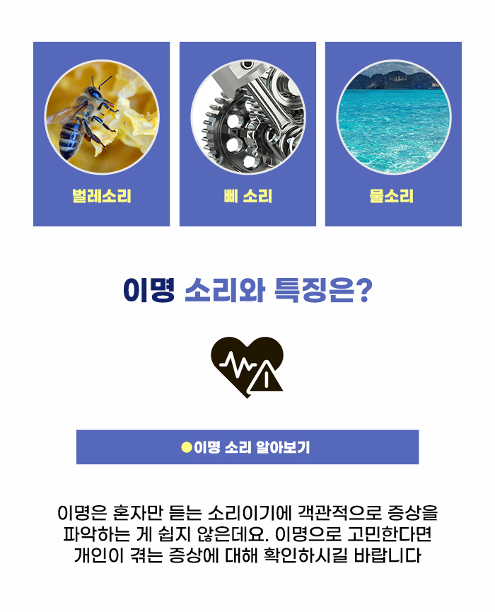 그런데 이와 반대로 원래는 듣지 말아야 하는 소리, 느끼지 말아야 하는 소리를 듣는 경우에도 고민이 될 수 있는데요. 원래대로라면 들리지 말아야 하는 소리를 듣는 것, 외부의 소리 자극이 뚜렷하게 없는 상태에서 소리를 듣는 것을 두고 이명이라고 합니다.