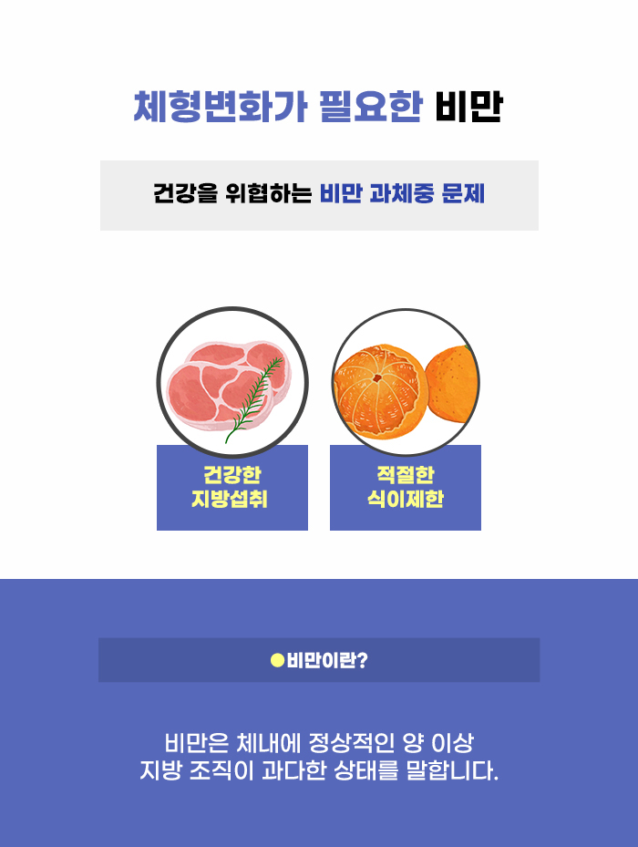 필요한 것 이상 음식을 먹고 칼로리를 받아들일 경우, 에너지로 쓰이고 남은 것들은 지방의 형태로 몸에 저장되는데요. 이렇게 지방의 형태로 저장되는 일이 반복되면서 몸에 정상적인 양 이상 지방 조직이 과다해진 상태가 될 수 있습니다. 이런 상태가 비만이라고 합니다.