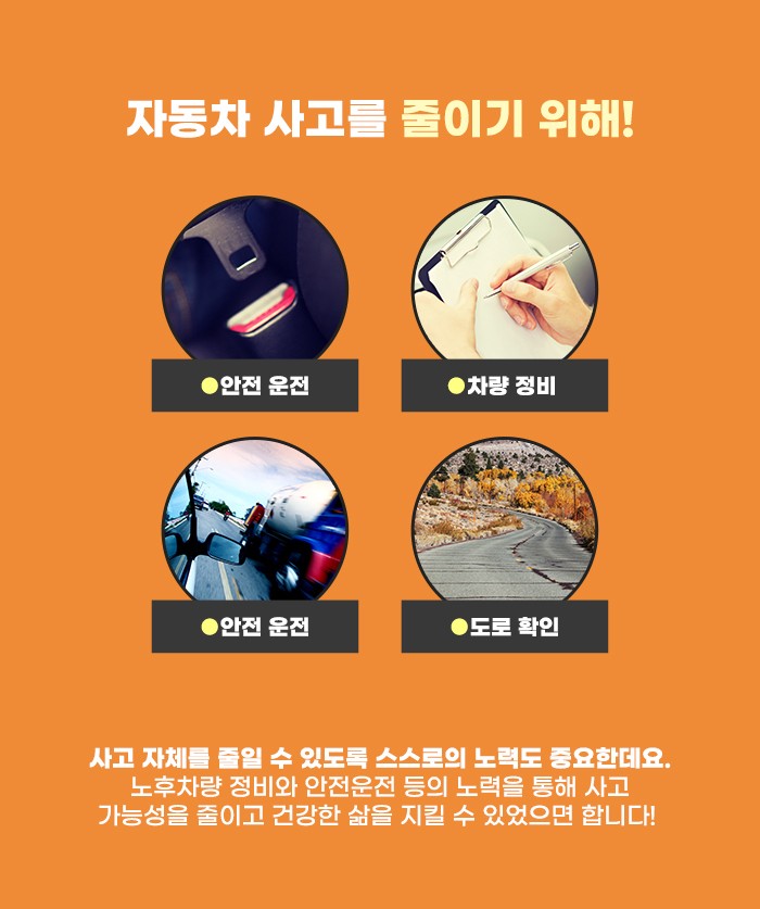 또한 많은 사고가 인명 피해까지 내고 있는데요. 사고 위험을 줄이기 위해 노력하는 것도 좋지만 운전을 하면서 방어 운전을 하고, 사고가 나지 않도록 주의하는 것도 필요하다고 합니다. 안전벨트 착용과 같은 기본적인 것을 지키는 것은 물론 눈/비가 오는 날 도로 상황 확인 등을 통해 사고 위험을 줄였으면 합니다.