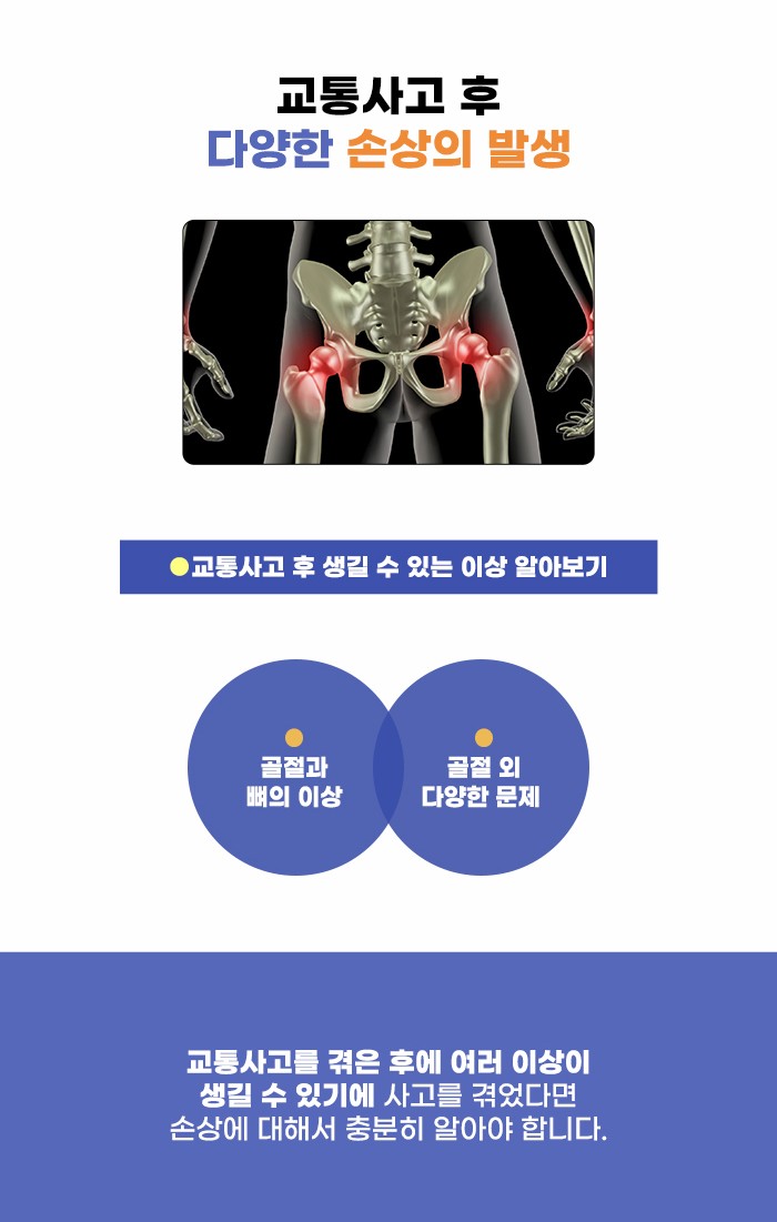 교통사고를 겪고 난 후에 몸에 크고 작은 손상이 생길 수 있는데요. 손상 규모에 따라서 완전히 나아지지 않고 장애가 남기도 하고, 통증 등의 후유증이 남기도 합니다. 그런데 큰 손상이 생긴 것은 아닌 것 같고, 겉으로 보이는 문제가 없는 것 같아도 후유증이 남을 수도 있다고 합니다. 교통사고 후에 골절이 없어도, 근육이나 근막, 인대 같은 부분의 이상이 있을 수도 있습니다.