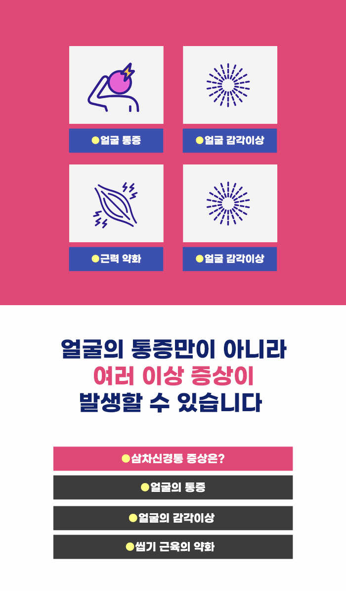 목이 좁은 스웨터나 티셔츠 같은 옷을 입을 때도 머리를 통과하면서 옷에 얼굴을 스치기도 합니다. 이런 일들은 일상적으로 행하는 별것 아닌 일들이지만, 삼차신경통 문제를 겪는 분은 이런 활동으로 인해 매우 강한 통증을 느낄 수도 있습니다. 또한 삼차신경은 씹기 근육의 움직임에도 관여하는 신경인데요. 그렇다 보니 씹기 근육의 약화, 음식을 먹는 것의 어려움이 생기기도 합니다.