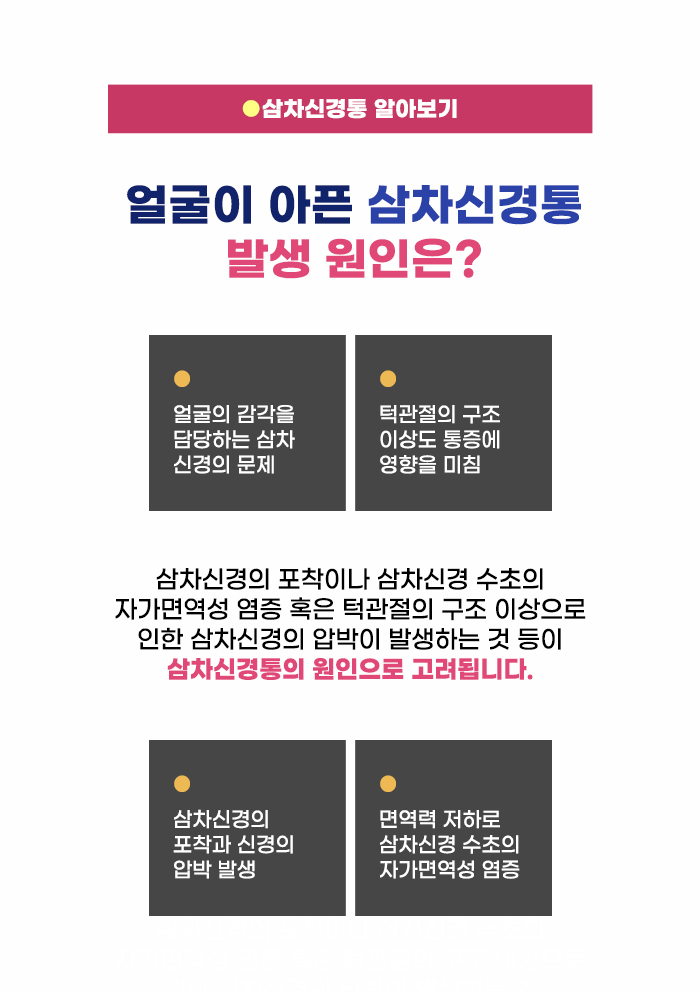 왜 평택봉침 정보 고민되는 삼차신경통이 생길까요? 삼차신경통이 생기는 이유는 명확하지 않을 수 있다고 합니다. 다만 몇 가지 우려되는 것을 알아보자면 삼차신경의 포착, 삼차신경의 압박, 면역력 저하로 인한 삼차신경 수초의 자가면역성 염증 등을 고려할 수도 있다고 합니다. 그리고 턱관절 구조 문제도 삼차신경통의 발생에 영향을 줄 수도 있다고 합니다.