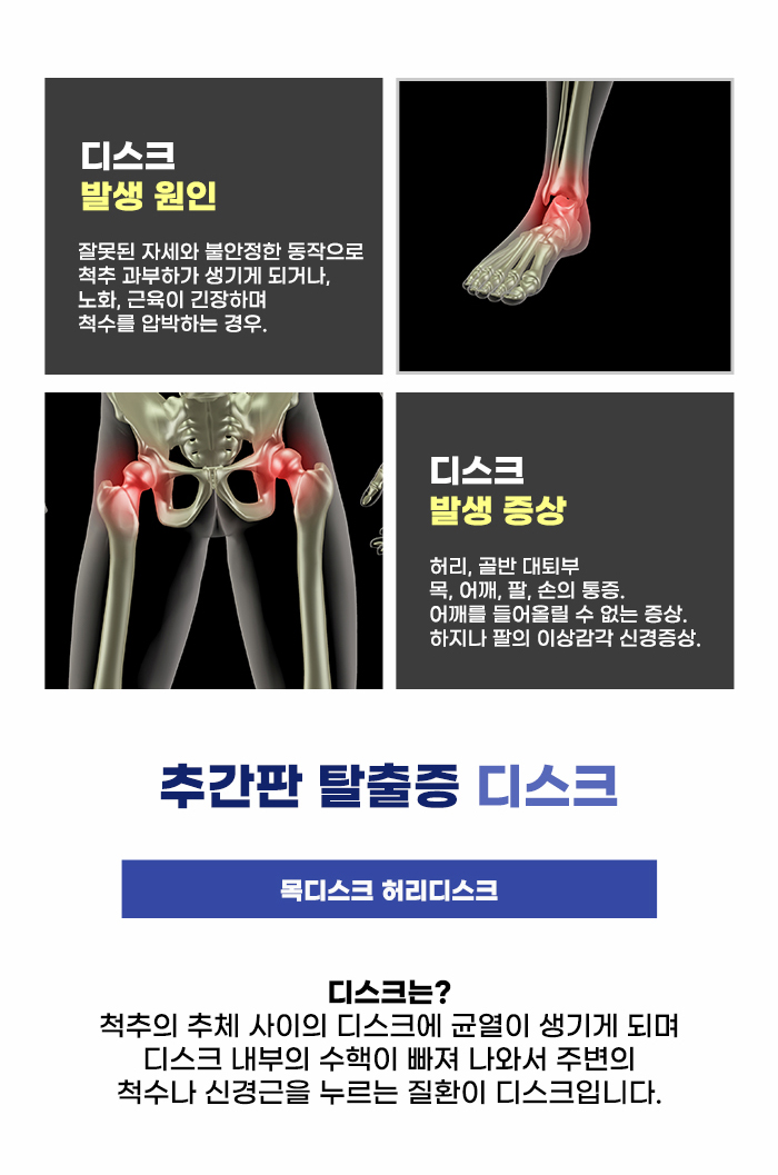 척추질환 중 대표적으로 알려진 디스크는 원래는 추간판 탈출증이라는 이름인데요. 추간판을 영어로 디스크라고 합니다. 이 추간판이라는 부분에 부담이 가해지면서 겉이 찢어지고 수핵이 밀려 나오는 것이 추간판 탈출증입니다. 노화로 인한 퇴행성 변화, 일상생활에서 생기는 지속적인 부담 등이 디스크 문제 발생에 영향을 주지면 교통사고 등 외상으로 인한 충격도 추간판 탈출증 발생에 영향을 줄 수도 있다고 합니다.