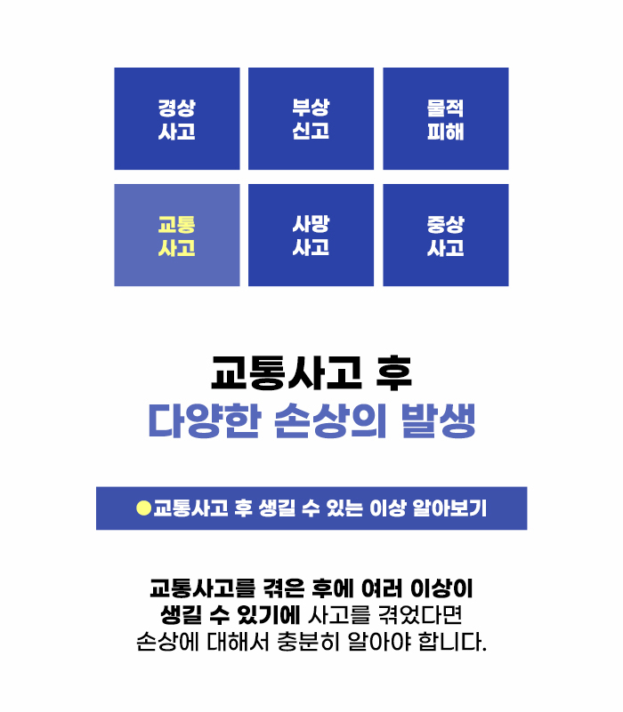 그런데 이렇게 바쁜 일들이 많다 보니 가장 중요한 것에는 소홀해질 수도 있습니다. 바로 나의 건강입니다. 사고 이후에는 몸에 다양한 손상이 생길 수 있습니다. 하지만 사고가 생긴 후에 겉으로 크게 이상도 없어 보이고, 본인이 생각하기에도 통증이 거의 없는 상태가 되기도 합니다. 그런데 자동차 사고 직후에는 스트레스 호르몬이 분비되고 또 바쁜 상황으로 인해 자기 몸에 생긴 이상을 알아채기 어려울 수도 있습니다.