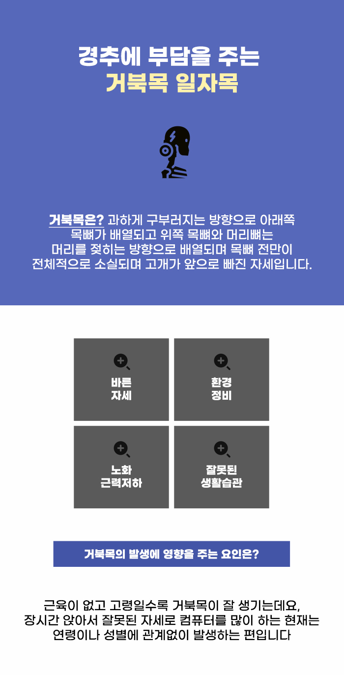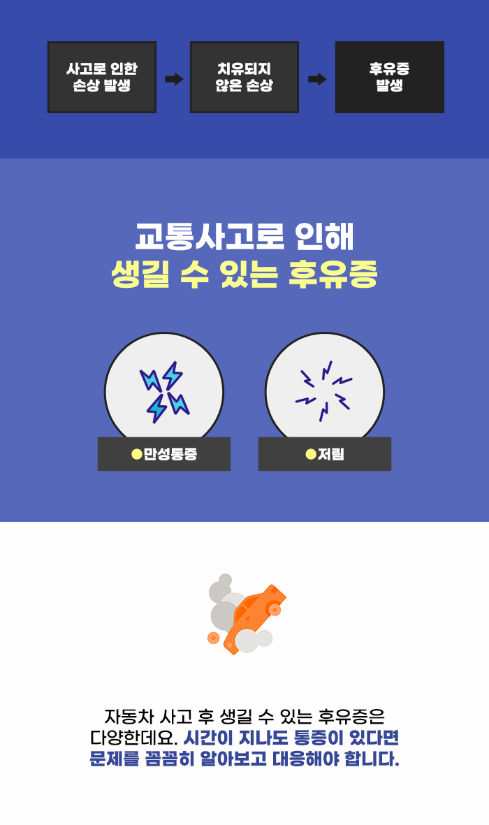 그리고 사고 후 몸의 균형이 어긋나거나 긴장된 상황이 이어지면서 다양한 문제가 발생할 가능성도 있습니다. 거북목이나 일자목 등 몸의 잘못된 자세는 척추질환과 연결되거나 만성통증으로 이어질 수도 있다고 하는데요, 사고 후 통증과 뻐근함이 사라지지 않는다면 내 몸의 문제를 꼼꼼히 알아보셔야 하겠습니다.