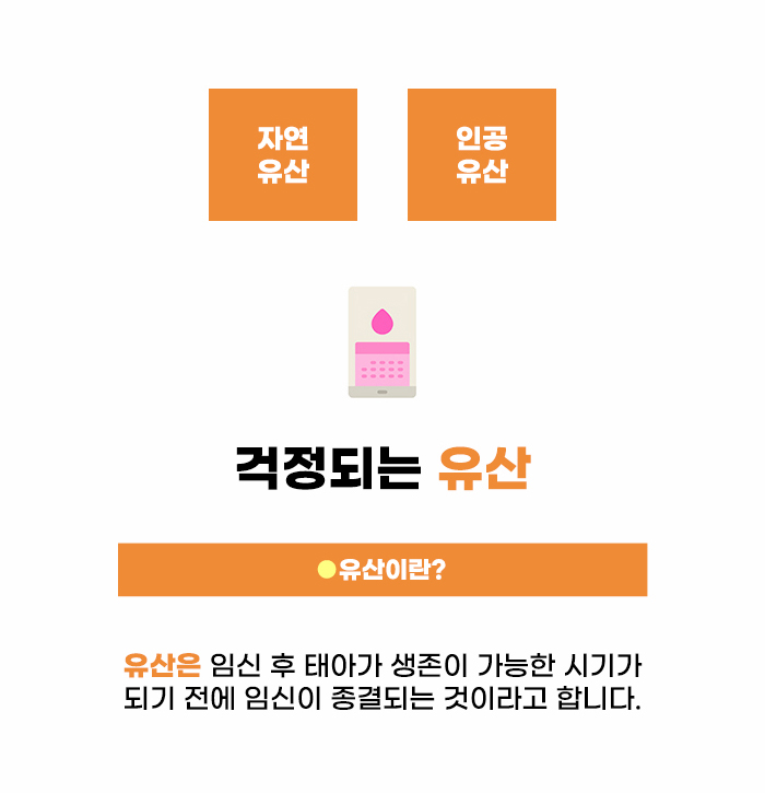 그리고 약물적 조치, 수술적 방법 등으로 임신을 종결시키는 것이 인공유산이라고 합니다. 일반적으로 자연유산의 경우에는 임신 20주 이전에 임신이 종결된다고 하는데요, 그리고 보통 임신의 20% 이상이 자연유산으로 이어지는 편이라고 합니다. 절박유산은 임신 20주 이전 출혈이 동반되는 자연유산 유형이라고 합니다.