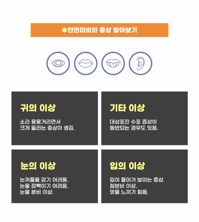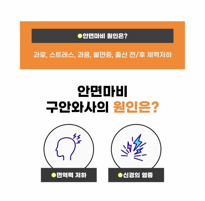 이런 구안와사 증상은 원인을 명확하게 밝히기 어려울 수도 있는데요. 면역력이 떨어지면서 염증이 생기기 쉬울 수 있습니다. 그렇기에 면역력을 낮추는 다양한 요인들이 안면신경 마비 증상의 발생에 영향을 주는 것으로 생각하기도 합니다. 피로, 과로, 스트레스, 과음 등이 영향을 줄 수도 있다고 하는데요. 임신 출산 과정에서 고생한 여성, 그리고 불면증이 있는 분의 경우에도 안면마비 증상을 겪기도 합니다.