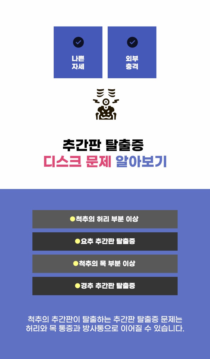 이 디스크는 추간판이라고 하는데요, 추간판에 과도한 압력이 가해지며 찢어지고 내부 수핵이 밀려 나오는 질환이 추간판 탈출증입니다. 강한 통증, 피로감, 두통 등이 생길 수도 있다고 하며, 어깨를 들어올리기 어려운 증상, 팔과 손의 저림 등 여러 문제가 생길 수도 있다고 합니다.