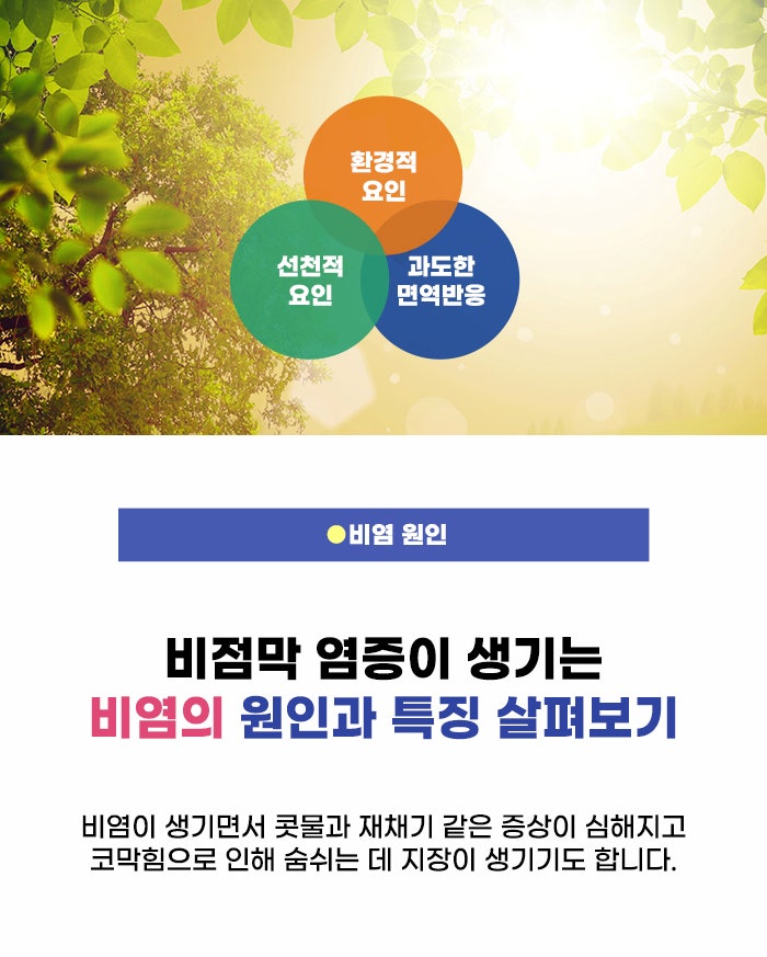 만성 비염에 대해 알아보자면 코 막힘이 중요 증상이라고 하는데요, 이런 증상이 오전에 심하고 오후에 완화되는 경우가 많다고 합니다. 보통 맑은 콧물이 흐르지만 감염이 있을 경우 화농성 황록색 비루가 보이기도 합니다. 또한 지속적인 염증 반응이 이어지며 신경이 노출되고 예민해지기도 하는데요, 이런 이유로 발작적인 재채기를 하기도 합니다.