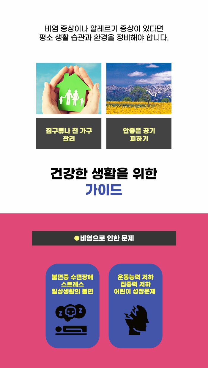 알레르기성 비염은 알레르겐에 노출되며 발작적인 재채기를 여러 번 하고, 맑은 콧물이 동시에 흐르는 증상이 특징인데요, 또한 눈과 코의 가려움증이 생기기도 하며 코 막힘이 생기기도 합니다. 그리고 전신 가려움증이 함께 생기는 경우도 있다고 합니다. 이런 증상이 이어지면 부비동염, 인후두염, 중이염 같은 증상으로 이어질 가능성도 있다고 합니다.