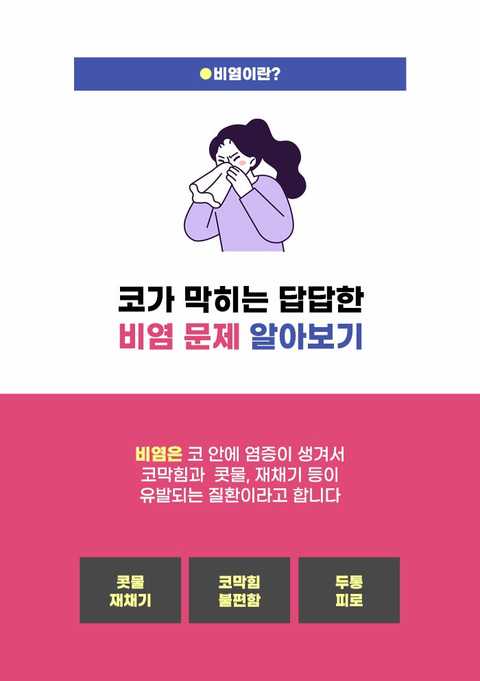 현재 걱정되는 증상, 고민되는 점이 있을 경우 방치하지 말고 증상을 꼼꼼히 알아보셨으면 합니다. 특히 요즘 비염으로 고민하는 분이 적지 않은 것 같은데요. 코안을 비강 안이라고 하는데요, 이 비강 내 염증을 두고 비염이라고 합니다. 비염은 여러 종류가 있는데요, 알레르기성 비염 그리고 만성 비염 등으로 고생하는 분이 많다고 합니다.
