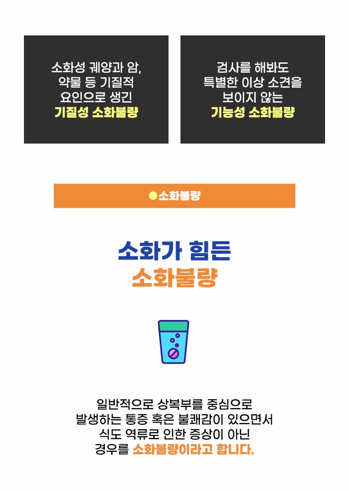 소화불량 증상은 내 몸이 필요한 에너지를 얻는 과정에 문제가 생겼다는 것을 의미하는데요, 장기적으로 건강과 생명에 큰 지장이 생길 수도 있기 때문입니다. 소화불량은 크게 소화성 궤양이나 약물, 질병 등의 원인으로 생기는 기질성 소화불량이 있으며 특별한 이상을 알기 어려운 기능성 소화불량이 있습니다.