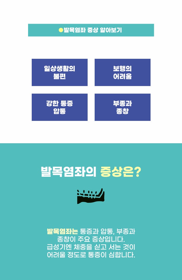 발목염좌로 인해 보행에 어려움이 생기기도 하지만, 다양한 이유로 발이나 발목 부분에 통증이 생기고 보행에 지장이 생기기도 합니다. 아킬레스건 파열과 염증, 그리고 연골이 소실되며 생기는 발가락 관절염 등이 있는데요, 또한 발바닥의 막에 염증이 생기는 족저근막염 등으로 인해 통증이 생기기도 합니다. 걷는 데 불편함이 생길 경우 일상생활에 큰 불편이 따르게 되는데요, 어려운 증상이 있을 경우 꼼꼼히 증상을 체크하고 건강을 지키기 위해 힘쓰시길 바라겠습니다.