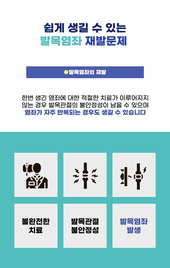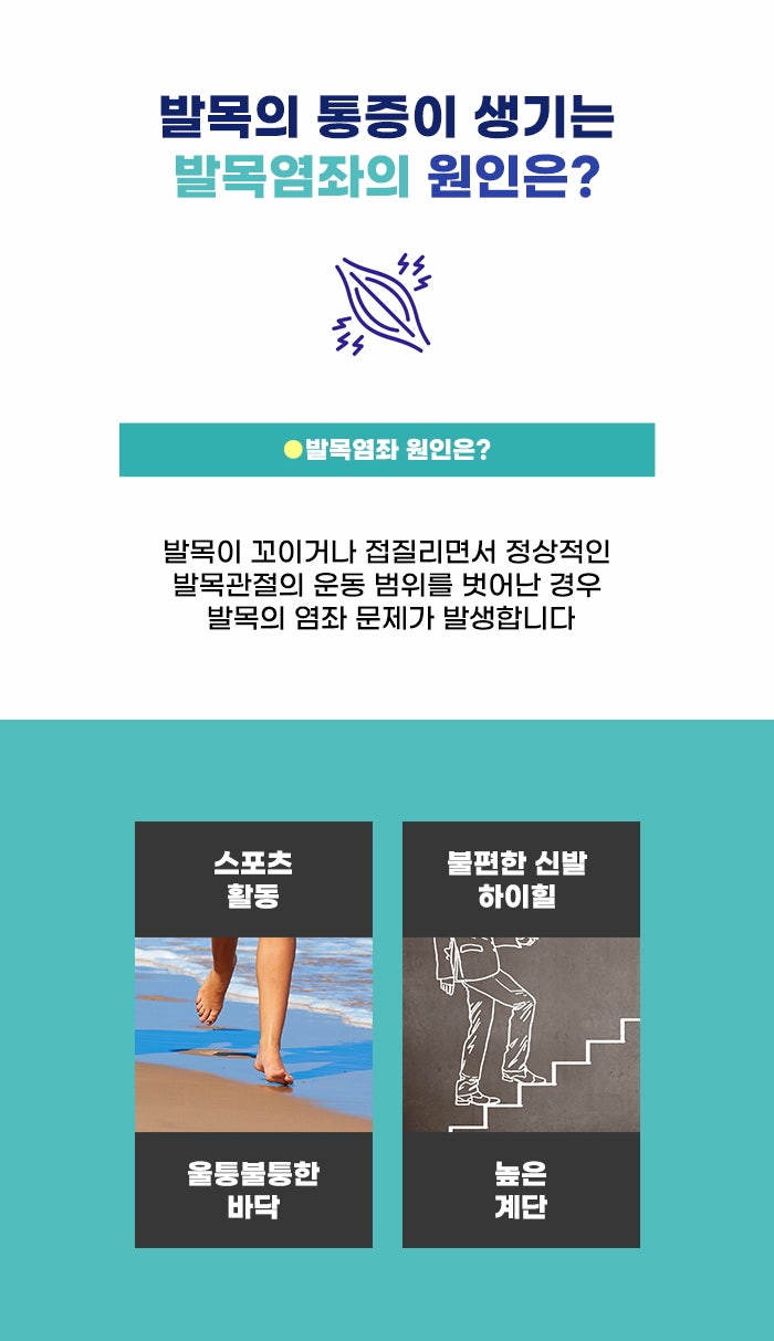 울퉁불퉁한 바닥이나 계단에서 발을 헛디디고 꺾이면서 손상이 생기는 경우도 있는데요. 또한 러닝 같은 운동을 하거나 축구 같은 여러 사람과 어울리는 운동을 하다 무리하면서 손상이 생기기도 합니다. 특히 러닝을 시작한 후에 기록을 내기 위해 노력하면서 무리한 운동을 하며 손상이 생길 수도 있는데요. 축구 같은 운동의 경우 여러 사람과 어울리며 경쟁적인 운동을 하다 보니 이런 이유로 손상이 생기는 경우도 있다고 합니다.