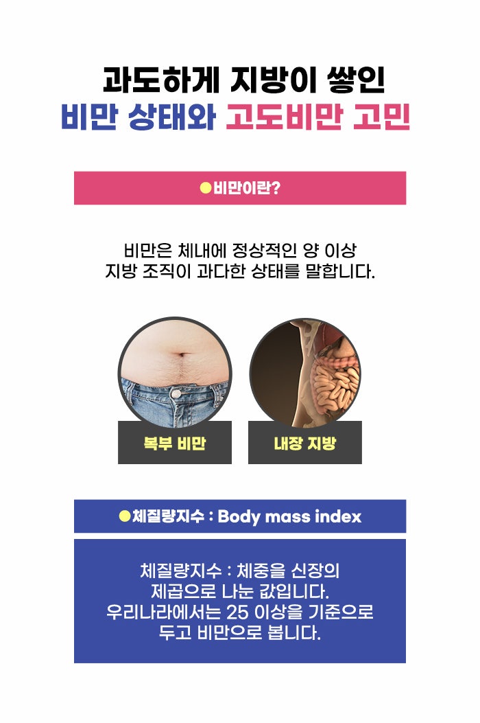 비만은 체내에 필요한 것 이상으로 지나치게 지방이 쌓인 상태를 말합니다. 체중이 많이 나가는 것만 비만의 기준이 아닌데요. 근육량이 많아 체중이 많이 나가는 경우에는 비만으로 보지 않는다고 합니다. 비만은 체질량지수로 알아볼 수 있는데요. 체중을 신장의 제곱으로 나눈 값이 25 이상인 경우 비만으로 보는 편이라고 합니다. 그리고 이 기준은 약간씩 다를 수 있습니다.