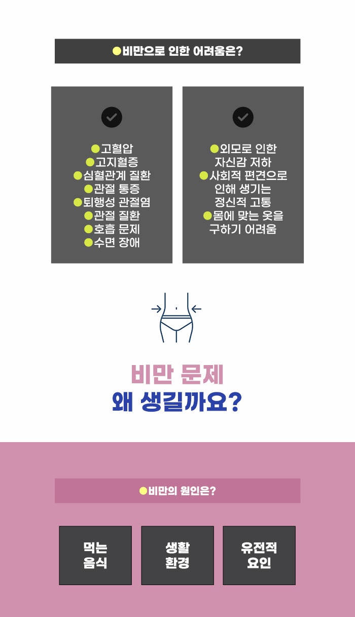 비만에 대해 이해하지 못하고 다이어트를 시도하는 분의 경우 살을 빼더라도 일시적으로 체중만 줄이는 결과가 되기 쉬울 수도 있다고 합니다. 식욕을 조절해 준다는 약을 먹은 후 건강 문제를 겪는 경우도 있다 보니 개인의 상황, 건강 상태를 고려해 바른 결정을 하는 게 중요하겠습니다. 다이어트는 한 번으로 끝나는 게 아니라 꾸준히 내 몸에 맞고 좋은 습관을 만들며 유지하는 것이라고 합니다.