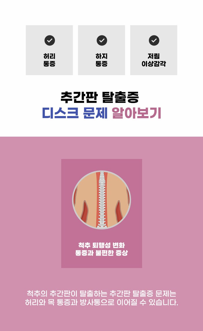 척추를 구성하는 구조물에 변성이 생기고 노화가 진행됨에 따라서 평택목디스크치료 걱정되는 증상이 생기기도 하는데요. 추간판 탈출증은 척추 질환 중 대표적으로 잘 알려진 증상이며 그만큼 많은 분이 겪는 증상입니다. 또한 추간판 탈출증과 함께 많은 분이 겪는 다른 척추 질환으로 추간공이 좁아지는 척추관 협착증이 있다고 하니 참고하셨으면 합니다.