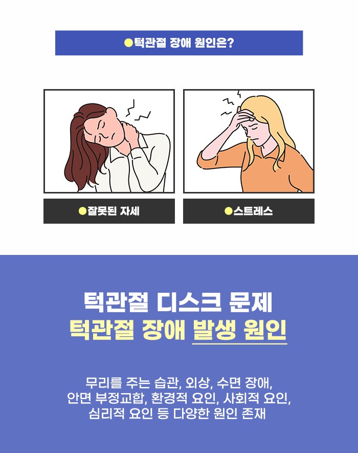 한쪽 턱관절에 이상이 있을 경우 다른 쪽 관절에도 이상을 줄 수도 있다고 하는데요. 또한 치아의 교합이 턱관절 장애 문제 발생에 영향을 줄 수도 있다고 합니다. 턱을 괴는 습관, 엎드리고 턱에 부담을 주며 자는 습관, 잘못된 자세와 거북목 등도 턱관절의 부담을 키울 수도 있다고 합니다. 또한 스트레스를 받으면 얼굴 근육과 턱 주변 근육이 긴장할 수도 있습니다. 이런 이유로 인해 턱관절 증상이 더 심해질 수도 있다고 합니다.