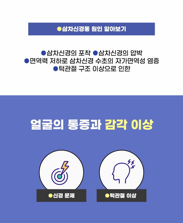 턱관절 장애로 인해 생기는 여러 문제도 알아봤는데요. 그런데 턱관절 구조 문제가 신경 압박을 불러올 수도 있고, 이로 인해 얼굴 통증이 생길 수도 있다는 점은 잘 모르는 분이 많은 것 같습니다. 얼굴과 머리에서 오는 감각 전달에 문제가 생기면서, 얼굴에 강한 통증이 나타나는 게 삼차신경통인데요. 현재 염려되는 증상이 있다면 나에게 필요한 이후의 과정을 알 수 있었으면 합니다!