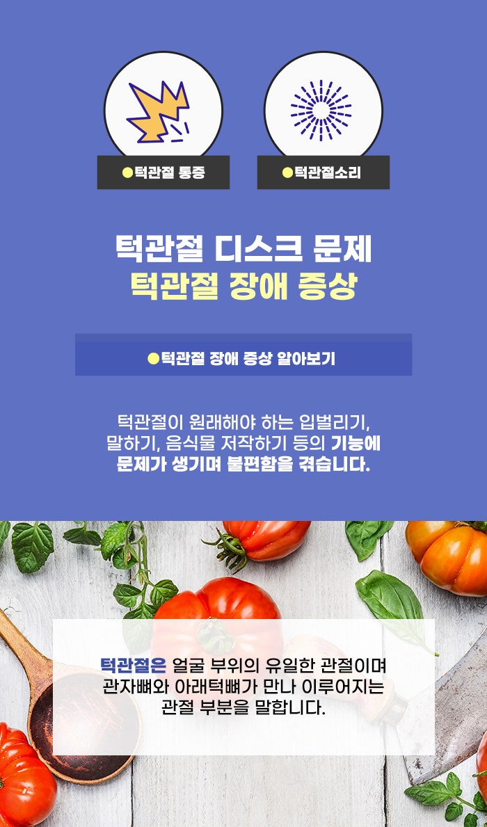 관자뼈 그리고 아래턱뼈가 만나 이루어지는 턱관절은 다른 말로는 측두하악관절이라고 불리기도 합니다. 이 턱관절은 얼굴에 있는 중요한 가동관절로 턱을 움직이는 역할을 합니다. 그리고 이 턱을 움직이는 역할을 부드럽게 하기 위해, 턱관절의 두 뼈 사이에는 디스크가 있습니다.